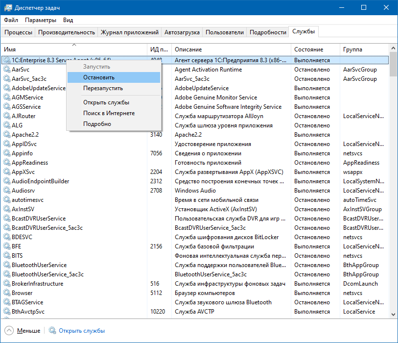 - Открываем службы, находим "1C:Enterprise 8.3 Server Agent (x86-64)" (Агент сервера 1С:Предприятия 8.3) и останавливаем ее. Можно это сделать через диспетчер задач (Ctrl+Alt+Del или Ctrl+Shift+Esc), если используете Windows 10.