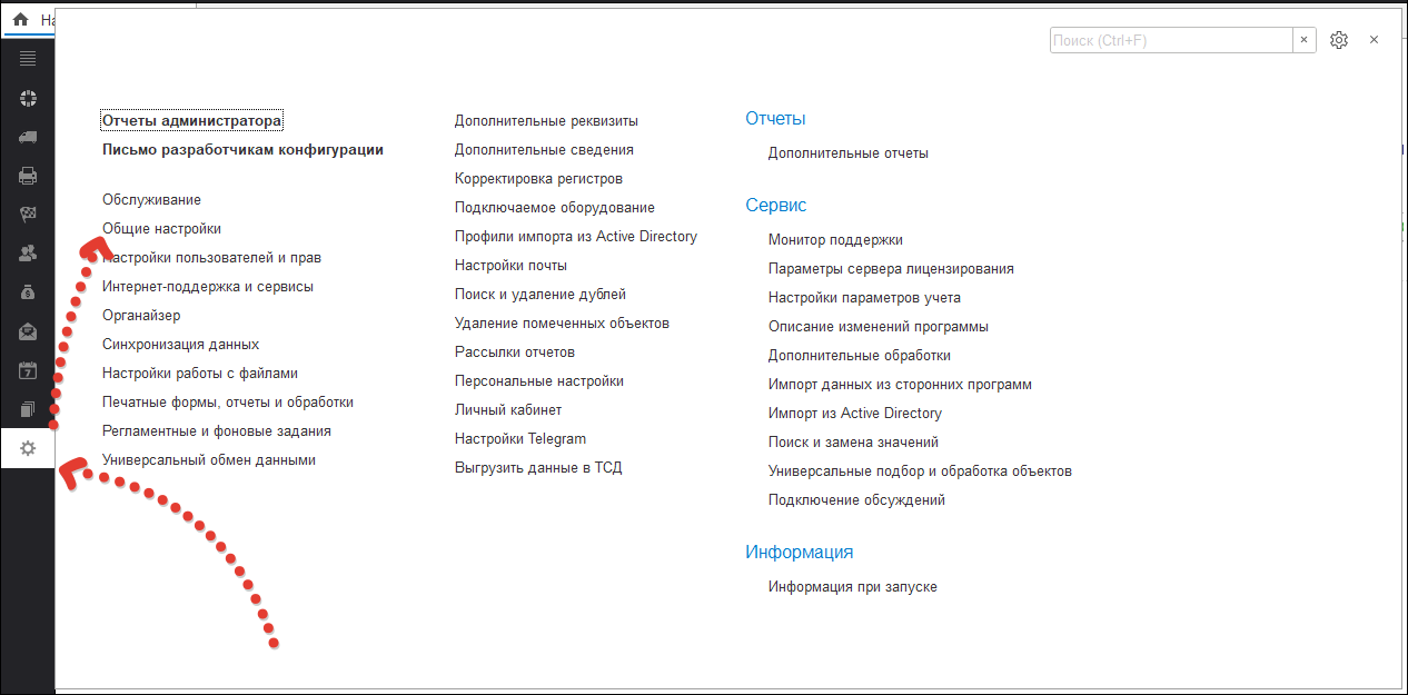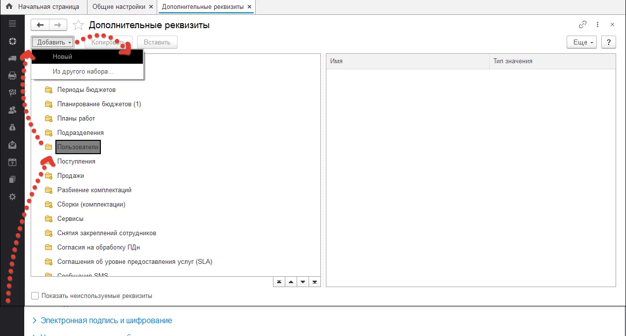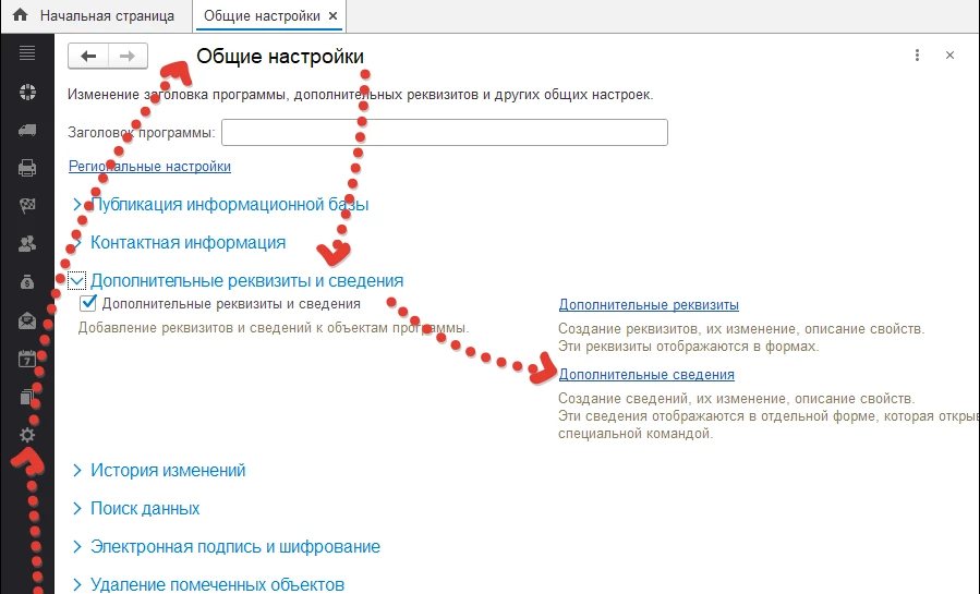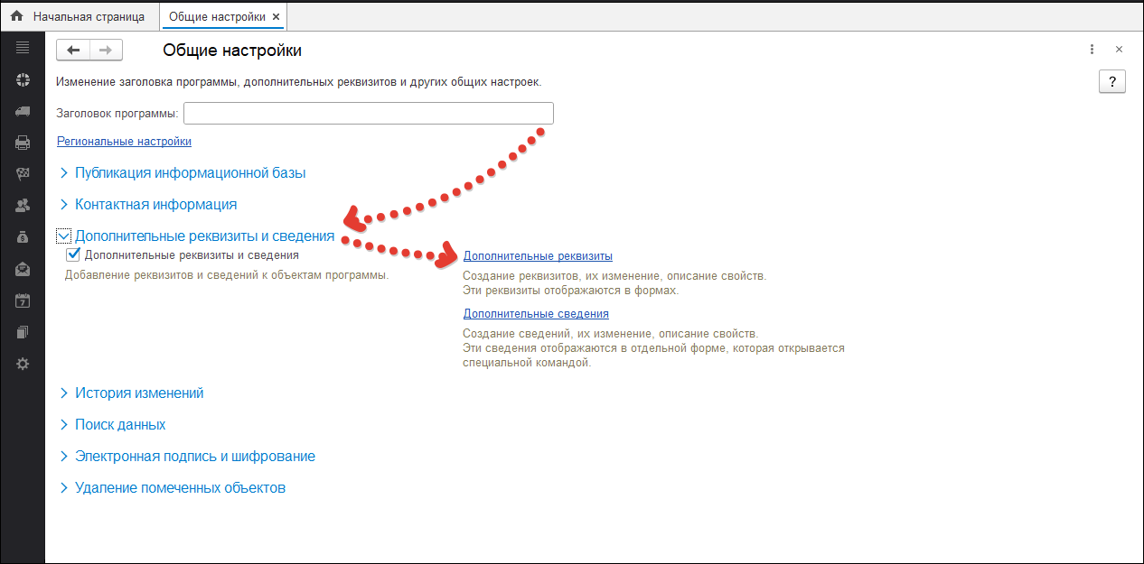 Дополнительные реквизиты и сведения включаются, создаются и настраиваются в разделе «Администрирование» в подразделе «Общие настройки».