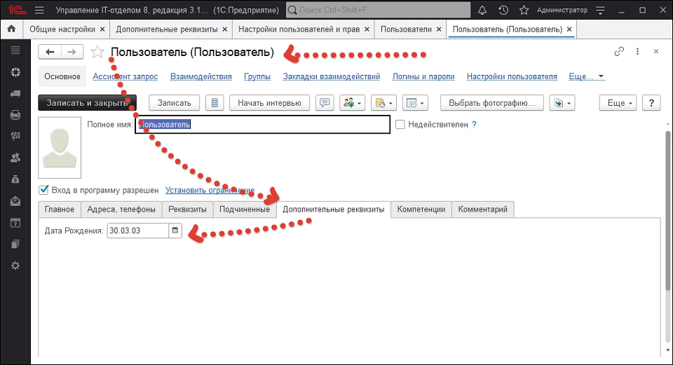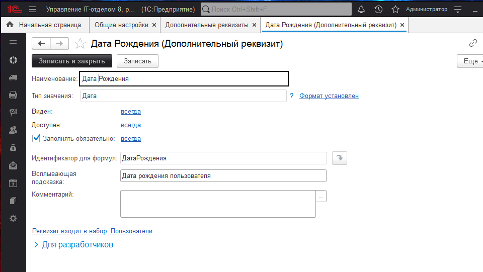 Перейдем теперь в справочник «Пользователи» и увидим наш дополнительный реквизит на вкладке «Дополнительные реквизиты».