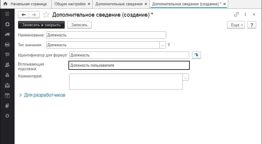 Перед нами откроется окно для создания и настройки дополнительного сведения. (Ниже расшифровка полей для заполнения).