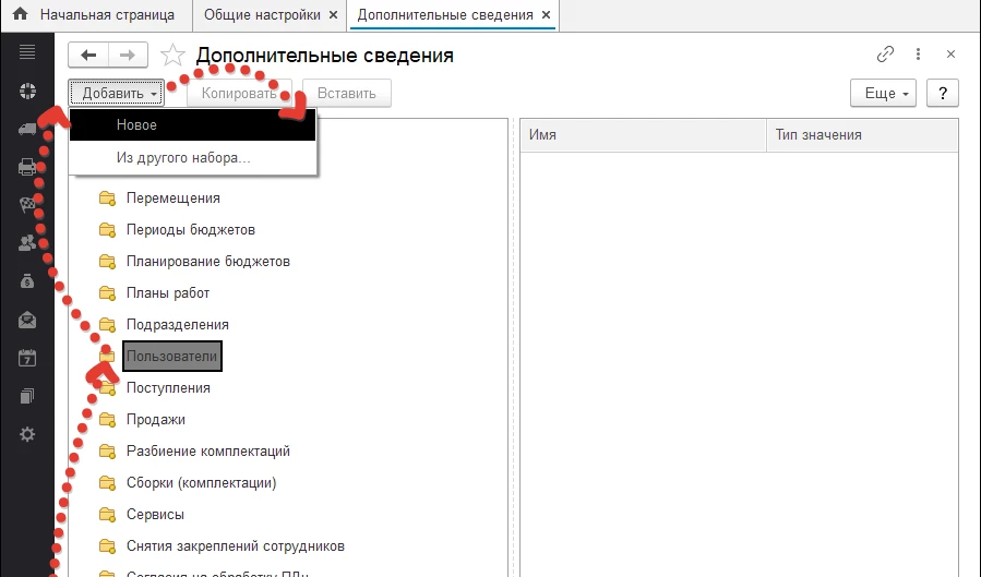 - Вкладка «Значения», появляется при выборе «Типа значения» «Дополнительное значения» для составления списка, из которого производится выбор.