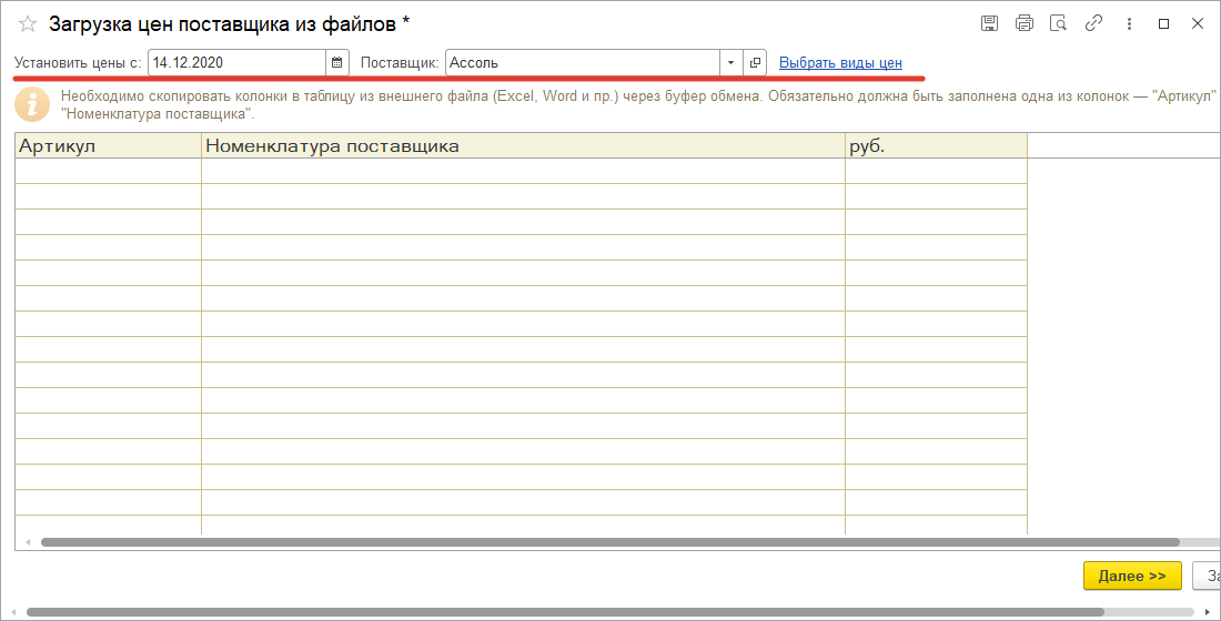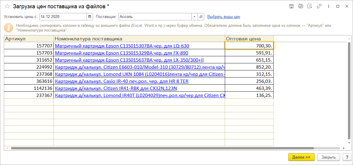 Поиск и дальнейшее сопоставление загружаемых данных в центральной базе осуществляться, либо по артикулу, либо по наименованию номенклатуры, которые загружены из excel. В связи с этим необходимо, чтобы в одной из этих колонок были заполнены данные из загружаемого прейскуранта. Это позволит обработке «Загрузка цен поставщика из файла» корректно обработать и сопоставить загружаемые данные с объектами, имеющимся в базе. В результате заполненная таблица будет выглядеть как на скриншоте ниже. После заполнения нажимаем кнопку «Далее».