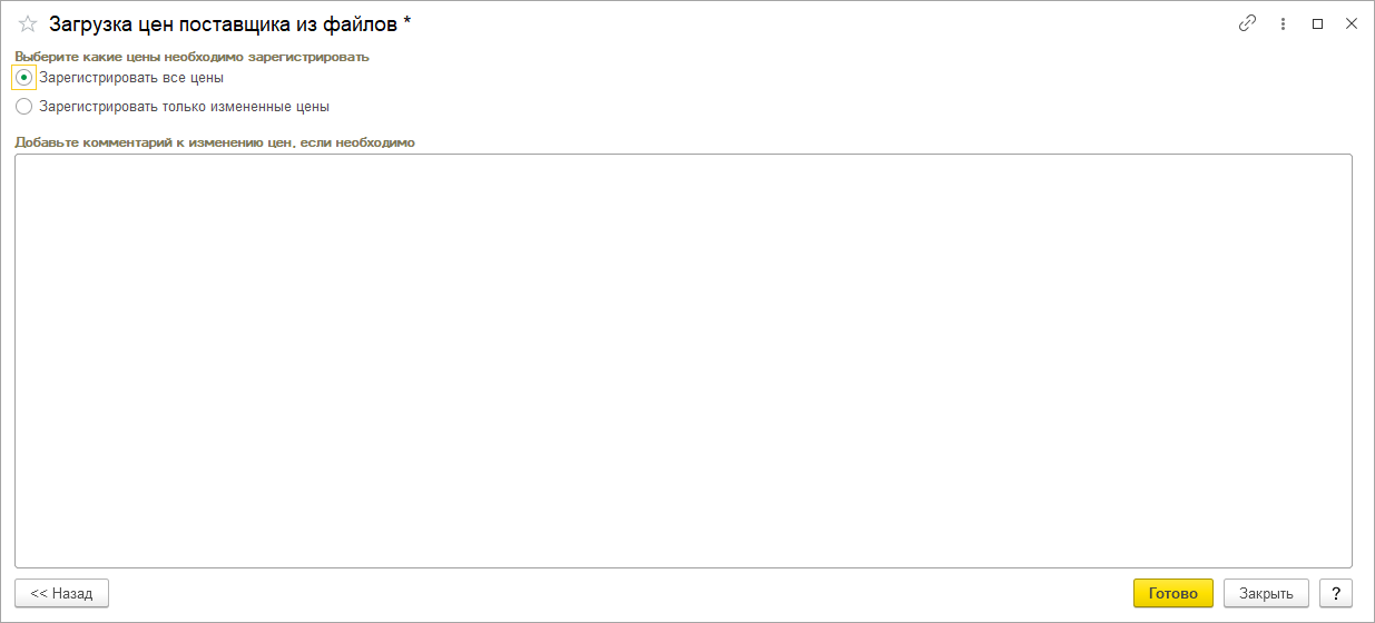 Появится окно, в котором необходимо выбрать один из предложенных вариантов регистрации цен. Чек-бокс «Зарегистрировать все цены» позволяет осуществить загрузку всех добавленных из прайс-листа цен, а чек-бокс «Зарегистрировать только измененные цены», регистрирует цены, которые были подвержены изменению в ходе работы с обработкой «Загрузка цен поставщика из файлов». После того как был сделан необходимый выбор, можно нажать на кнопку «Готово» и создать документ, который имеет название «Регистрация цен поставщиков».