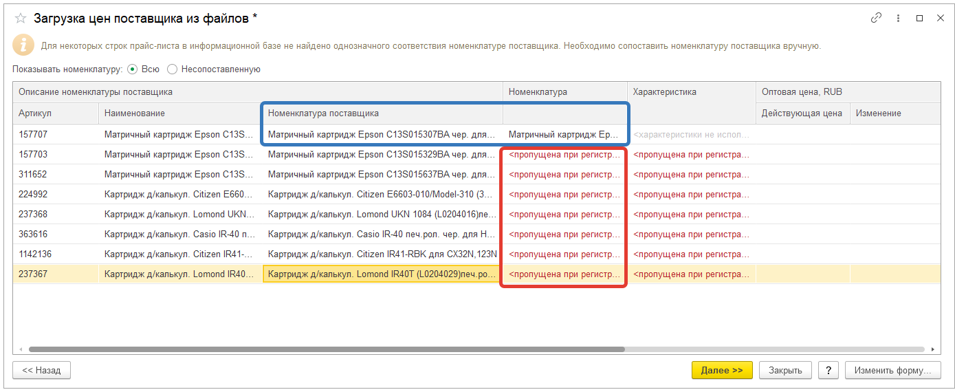 Следом появится окно, в котором будут отображаться сопоставления обрабатываемых объектов. В случае, если сопоставление найдено, тогда в соответствующей колонке будет подставлено необходимое значение (выделено синим на скриншоте ниже). В противном случае будет отмечен пропуск при регистрации (выделен красным на скриншоте ниже), означающий, что соответствий в базе не найдено. А это значит, что новые объекты при загрузке не будут созданы. Их необходимо создать вручную. После этого следует нажать кнопку «далее» и продолжить.