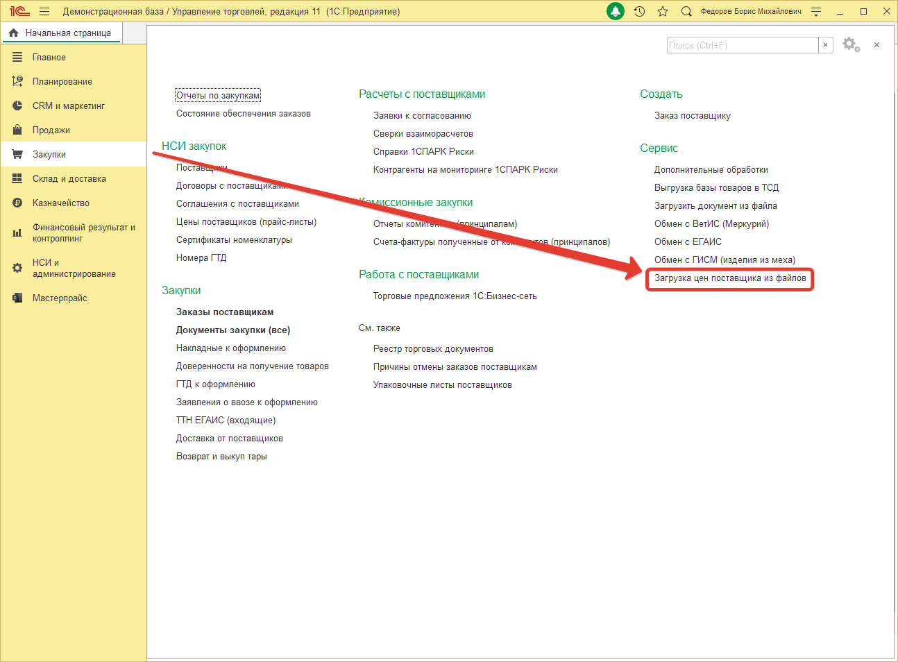 Перед тем как приступить к загрузке, первым делом стоит выполнить резервное копирование центральной базы во избежание проблем. После того как успешно создан бэкап базы, приступим. Открываем конфигурацию и переходим в раздел меню «Закупки», а далее подраздел «Сервис» - «Загрузка цен поставщика из файлов».