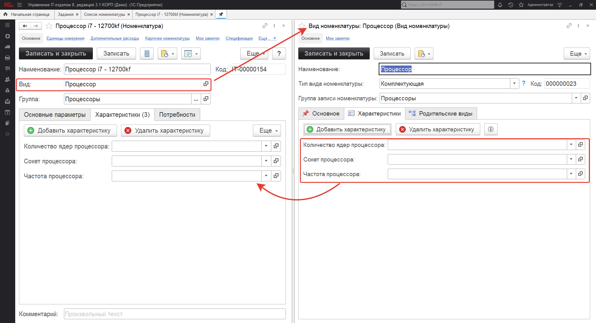 - Характеристика номенклатуры - представляет собой подробное описание особенностей товара или услуги. Например, для видеокарты это могут быть характеристики, такие как производитель, модель, объем памяти и другие параметры.