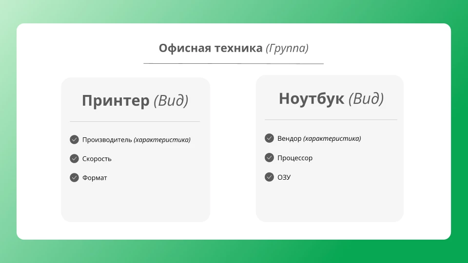 - Группа: может входить в "Офисная техника" далее "Компьютеры" и т.п.