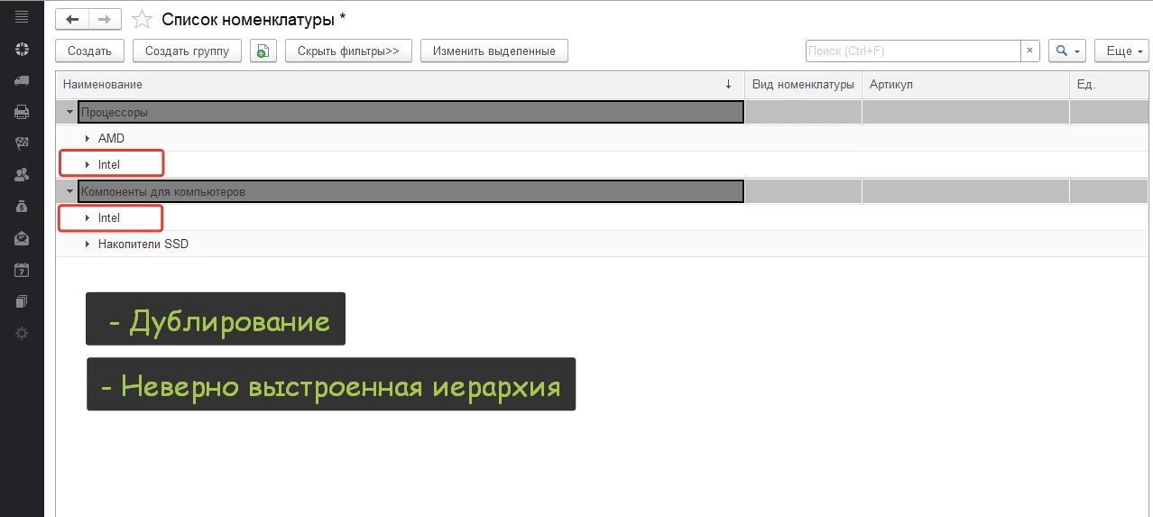 Такое дублирование и пересечение категорий в справочнике вызывает ряд следующих проблем: