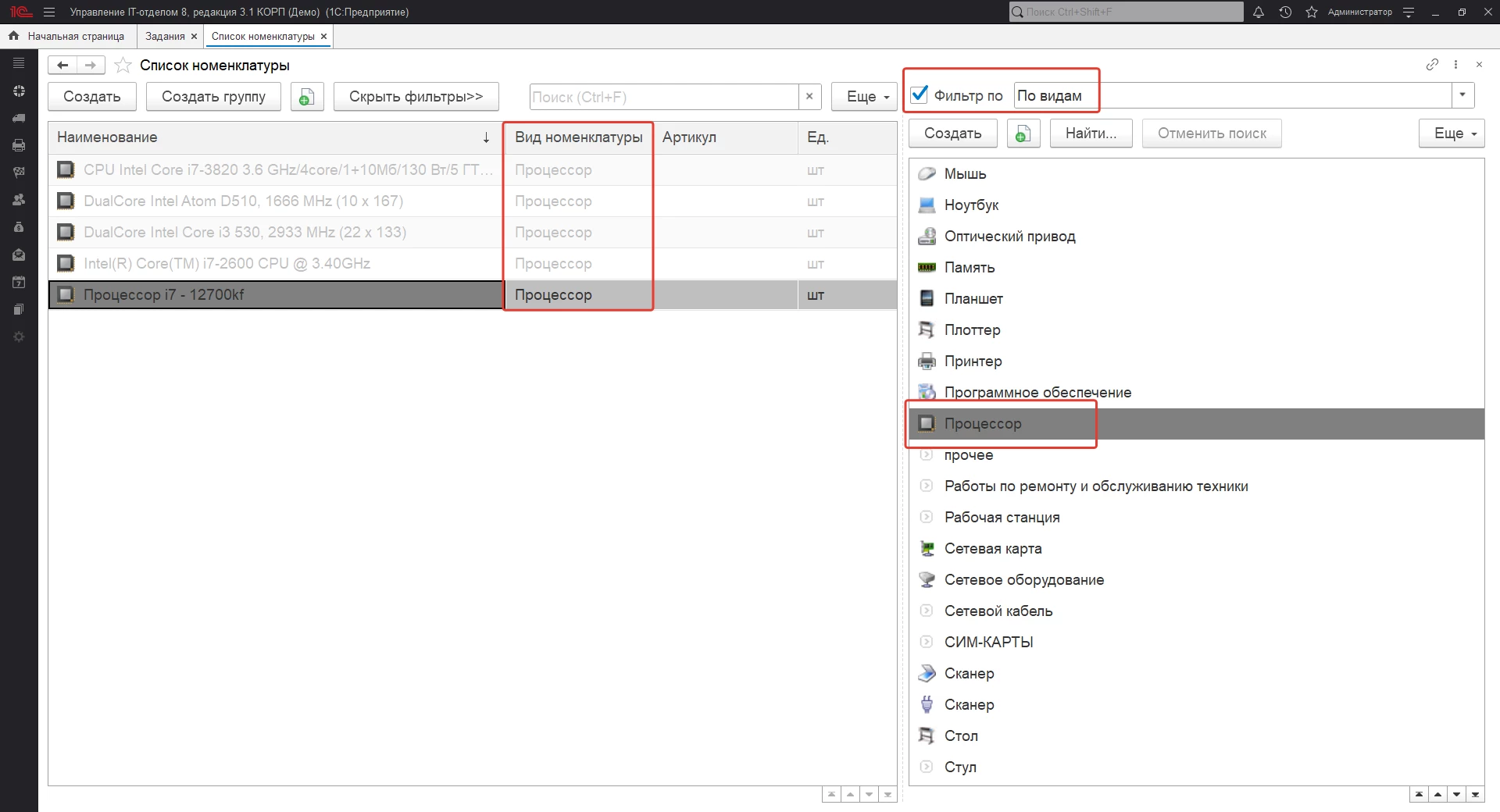 Далее нам остается лишь использовать фильтры по ранее заведенным данным, что позволяет быстро производить отбор, подбирать нужные позиции в документах и в целом делает наш справочник "прозрачным", свободным от "мусора".