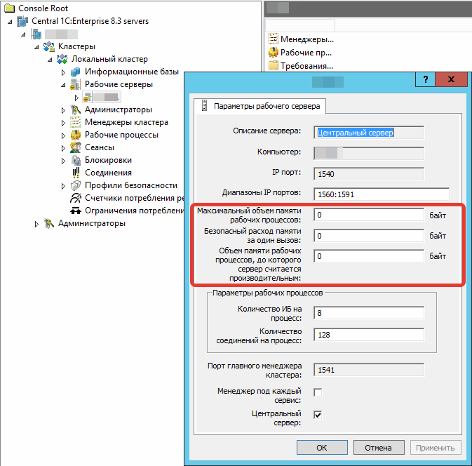 Может ли по памяти сеанс одного из пользователей временами быть больше чем расчетные 300 Мб? Вообще легко! Память процессы rphost очень любят. Везде стоят по умолчанию в настройках "0" (ноль) и это означает, что сервер 1С будет завершать сеансы при нехватке памяти. Т.е., казалось бы, 1С сделала благое дело пытаясь помочь убрать из базы лишнюю нагрузку, которая блокирует работу остальных, но при таком раскладе как в примере, все это приводит к тому, что при слабых серверах страдают бессистемно вообще все. А самое забавное, что до версии 8.3.12 они ведь как-то работали?