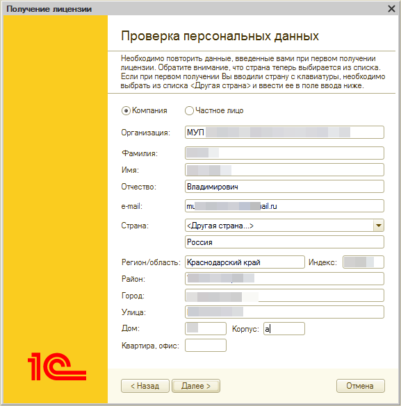 - Регистрационные данные, т.е. данные о владельце лицензии 1С которые вводились при первой регистрации;