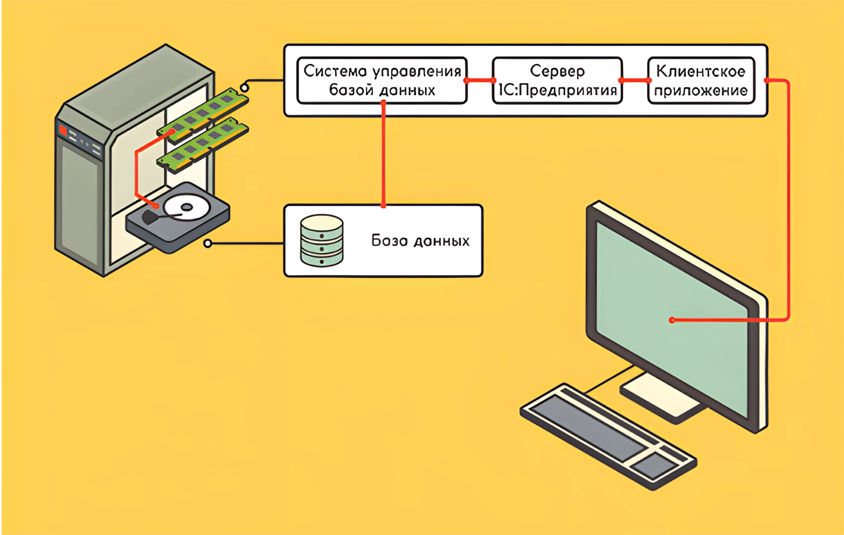 Первым делом следует обратить внимание на параметры вашего сервера. Больше всего 1С любит высокую частоту работы процессора, нежели количество ядер. Никаких HDD - только высокоскоростные диски: sata SSD и SSD NVMe для ускорения процесса записи и чтения. При этом нужно понимать, что необходим достаточный объем оперативной памяти для того, чтобы обеспечить памятью кластер серверов и СУБД , помимо других ресурсоемких процессов. Подробнее об особенностях 1С и о том, как собрать сервер читайте в нашей статье: