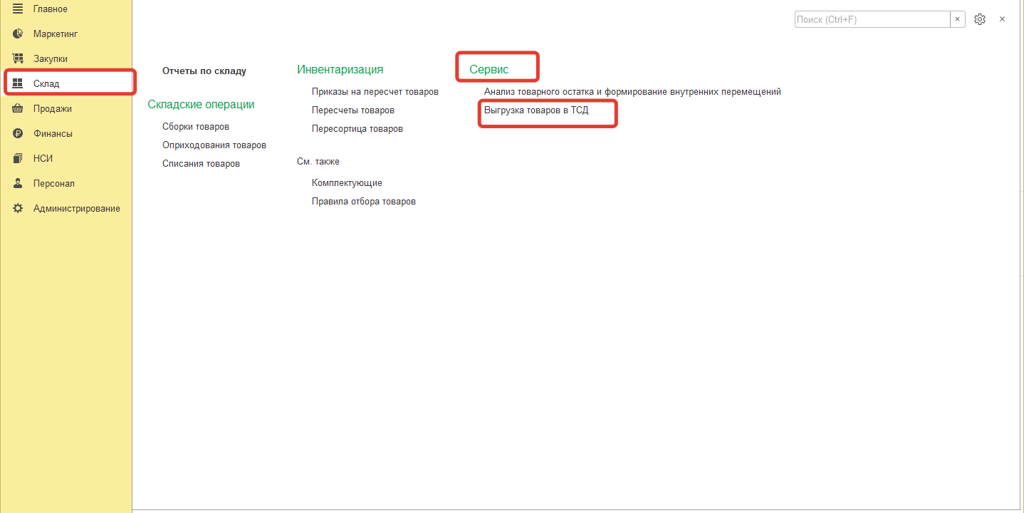Первым делом загружаем нашу номенклатуру со штрихкодами на Терминал Сбора Данных. Для этого в 1С:Розница предусмотрен следующий механизм. В разделе «Склад» в подразделе «Сервис» есть пункт «Выгрузка товаров в ТСД» ее и запустим. В открывшемся окне нажимаем на кнопку «Заполнить товары», которая заполнит табличную часть товарами. Стоит обратить внимание, что заполняет обработка по- умолчанию только теми товарами, у которых присвоен штрихкод. Для того чтобы изменить этот отбор, воспользуйтесь полем вверху «Отбор товаров». После того как определились с товарами для загрузки, нажимаем на кнопку «Выгрузить в ТСД» и ждем сообщения об успешной загрузке.