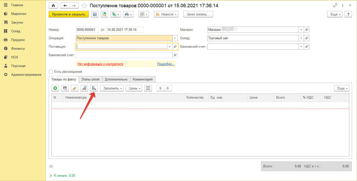 После того как посчитали нашу номенклатуру пришло время загрузить информацию в 1С. Это может быть документ «Поступление» или документ «Инвентаризация» или другой документ, в котором присутствует табличная часть, и рассчитанный на работу с ТСД (это видно по соответствующим пиктограммам). Создадим новый документ поступления. Для этого перейдем в раздел «Закупки» далее «Поступление товаров» и нажмем кнопку «Создать». После заполнения «шапки документа» нажимаем на «Загрузить из ТСД» которая отмечена пиктограммой с ТСД и исходящей стрелочкой. Стоит отметить, что при загрузке из ТСД информации в табличную часть документ пересчета на самом ТСД открыт. Ждем успешной загрузки в табличную часть .