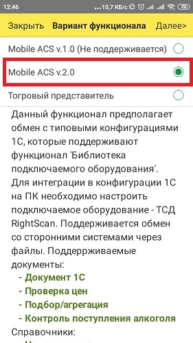 Сначала установим программное обеспечение на Терминал Сбора Данных Urovo. Переходим на сайт компании https://www.rightscan.ru, переходим в раздел «Готовые решения» и качаем apk- файл с названием «Мобильная торговля» или «RS.Mobile ACS». Подключаем Терминал Сбора Данных к компьютеру с помощью USB шнура. Через шторку в параметрах подключения на терминале выбираем строку «Медиа устройство (MTP)». Далее переходим на нашем ПК в «Мой компьютер», найти наше устройство и скопировать в него, скачанный файл (например папку «download»). На нашем терминале заходим в "проводник" «Файлы» (на нашей модели для этого делаем "свайп" снизу вверх) находим, скопированный с компьютера файл apk, и запускаем, тем самым начав процесс установки. Сам процесс установки прост и не требует внимания. После установки приложения, для корректной работы программы с 1 заходим в «Настройки» - «Настройки сканера» и проверяем наличие установки флага в сроке «Сканировать в поле». Если стоит, то убираем. Теперь запускаем установленное приложение. При первом запуске программа спросит о режиме работы ПО. Так как предполагается обмен с 1с «Розница», то выбираем «1С Документы» или «Mobile ACS v.2.0». Наш ТСД будет делать обмен через WiFi сеть.