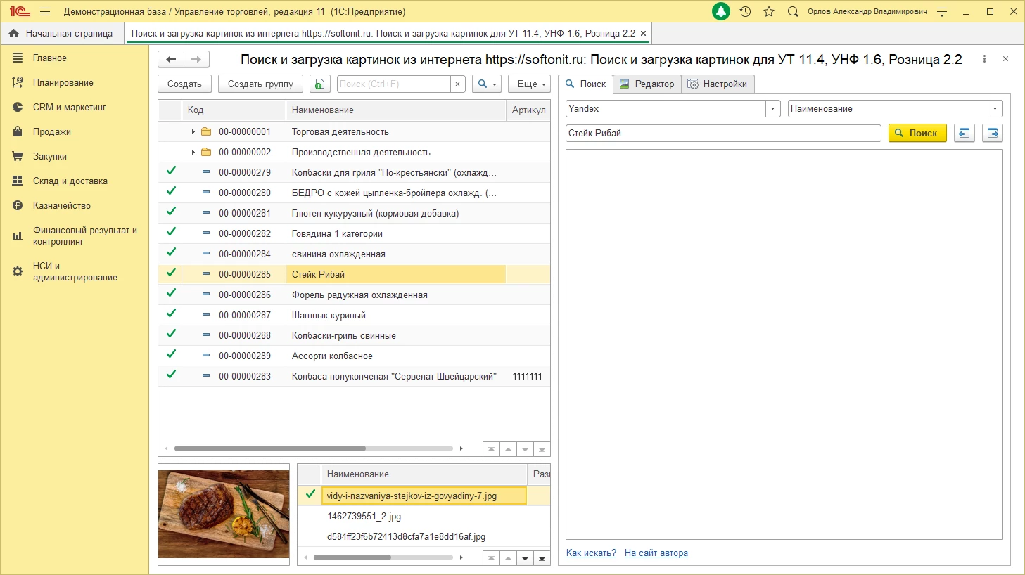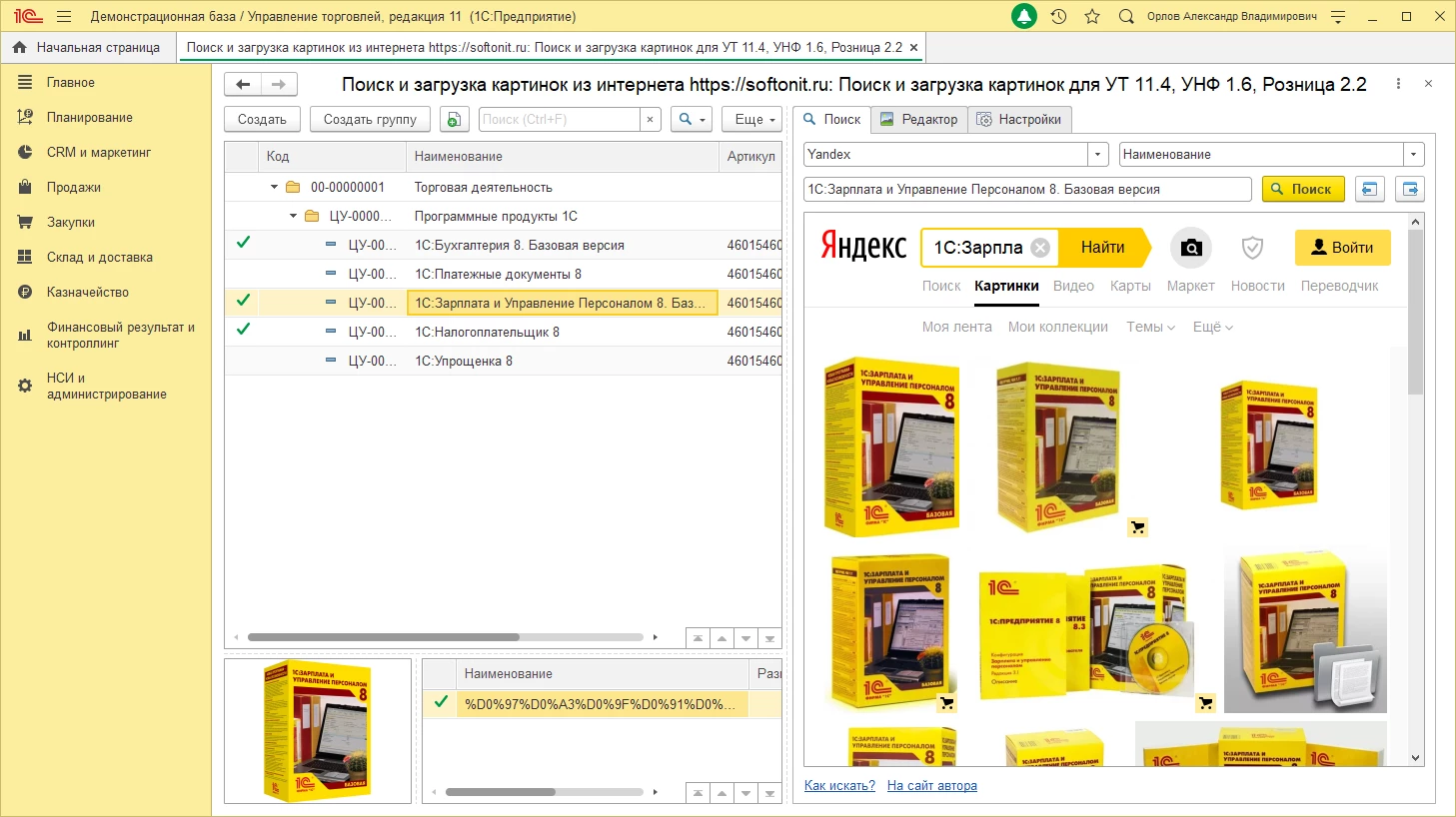 Загрузка картинок в 1С осуществляется нажатием пары кнопок, при чем поиск происходит максимально точно по разным параметрам. Можно искать изображения по наименованию, полному наименованию, по артикулу и связке наименование-артикул. Используя подобную автоматизированную установку изображения товара, например, в «Управлении торговлей 11» можно сократить время на рутинном заполнении информации о товаре.
