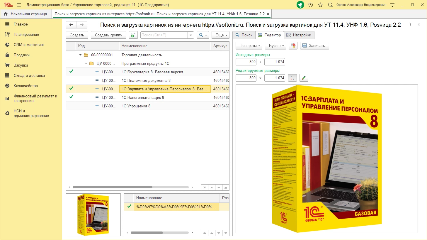 Функционал обработки позволяет редактировать найденные изображения с помощью встроенного редактора. Появляется возможность изменения размеров картинки товара в 1С, также можно поворачивать и отражать (по вертикали и горизонтали) изображение. Есть возможность работать с буфером обмена (вставлять, копировать).