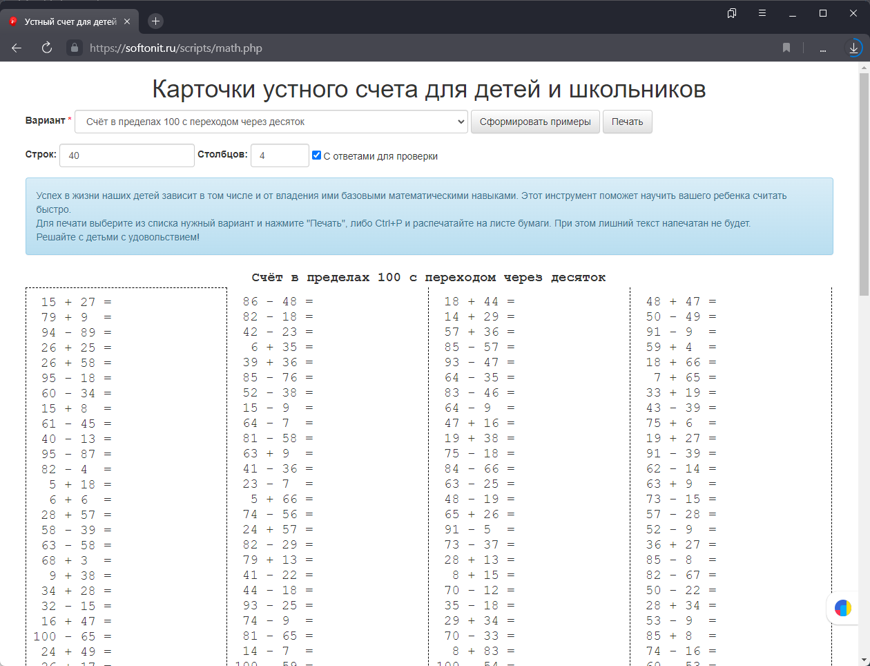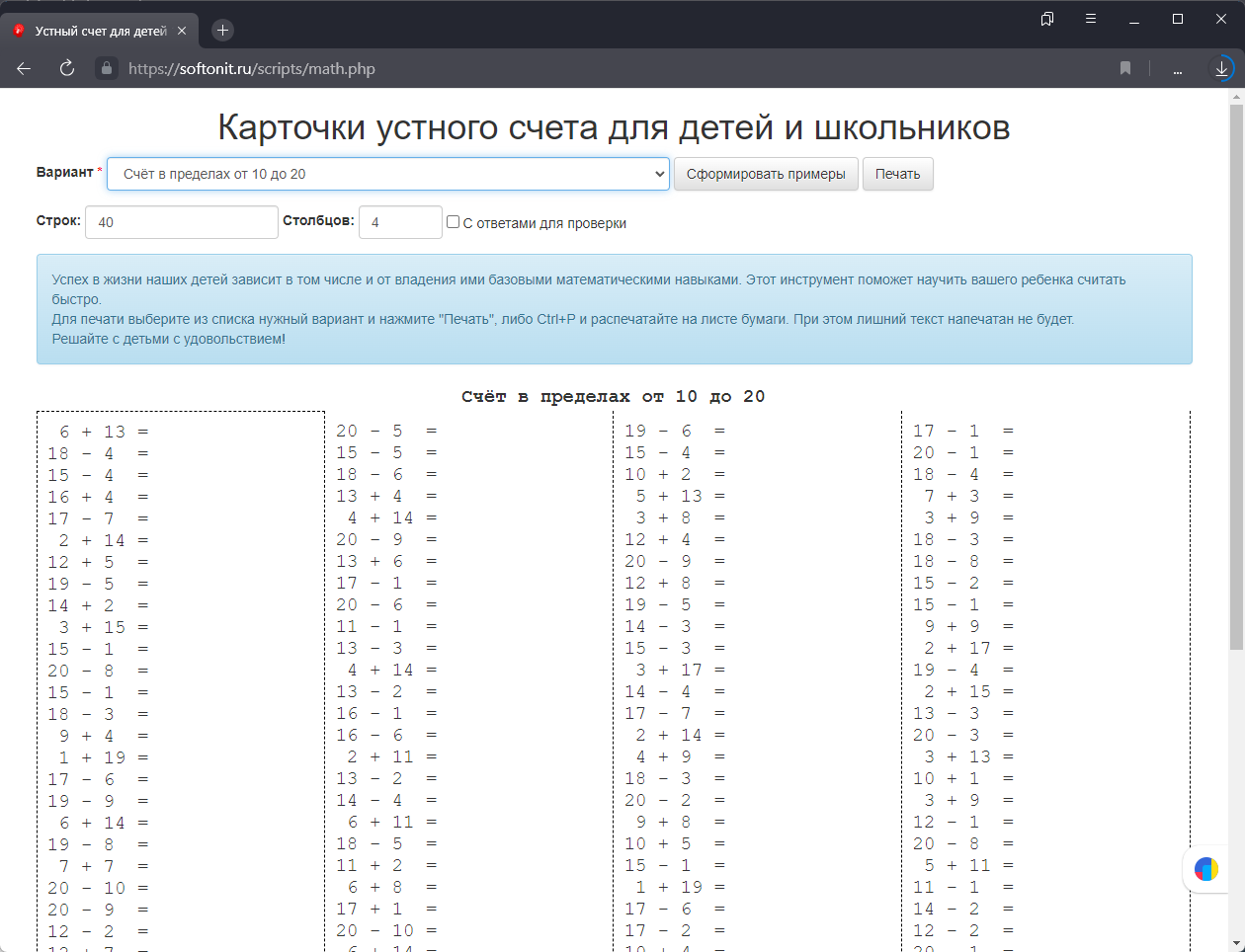 - Для печати карточек устного счета нажмите Печать, либо Ctrl+P и распечатайте на листе бумаги. При этом лишний текст не будет напечатан.