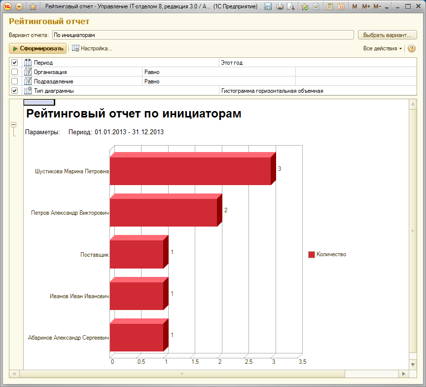Данный отчет может привлечь внимание как руководства, так и самого инициатора заявок. Если обратит внимание на данный отчет руководство, то невольного могут возникнуть вопросы, а почему этот человек так часто звонит? Да и сам инициатор при виде подобного отчета будет не очень рад увидеть себя в списках людей, которые ставят больше всего задач. Как показывает практика, на следующий месяц количество заявок от таких пользователей стремительно сокращается, после того, как они обнаруживают себя в подобном списке.