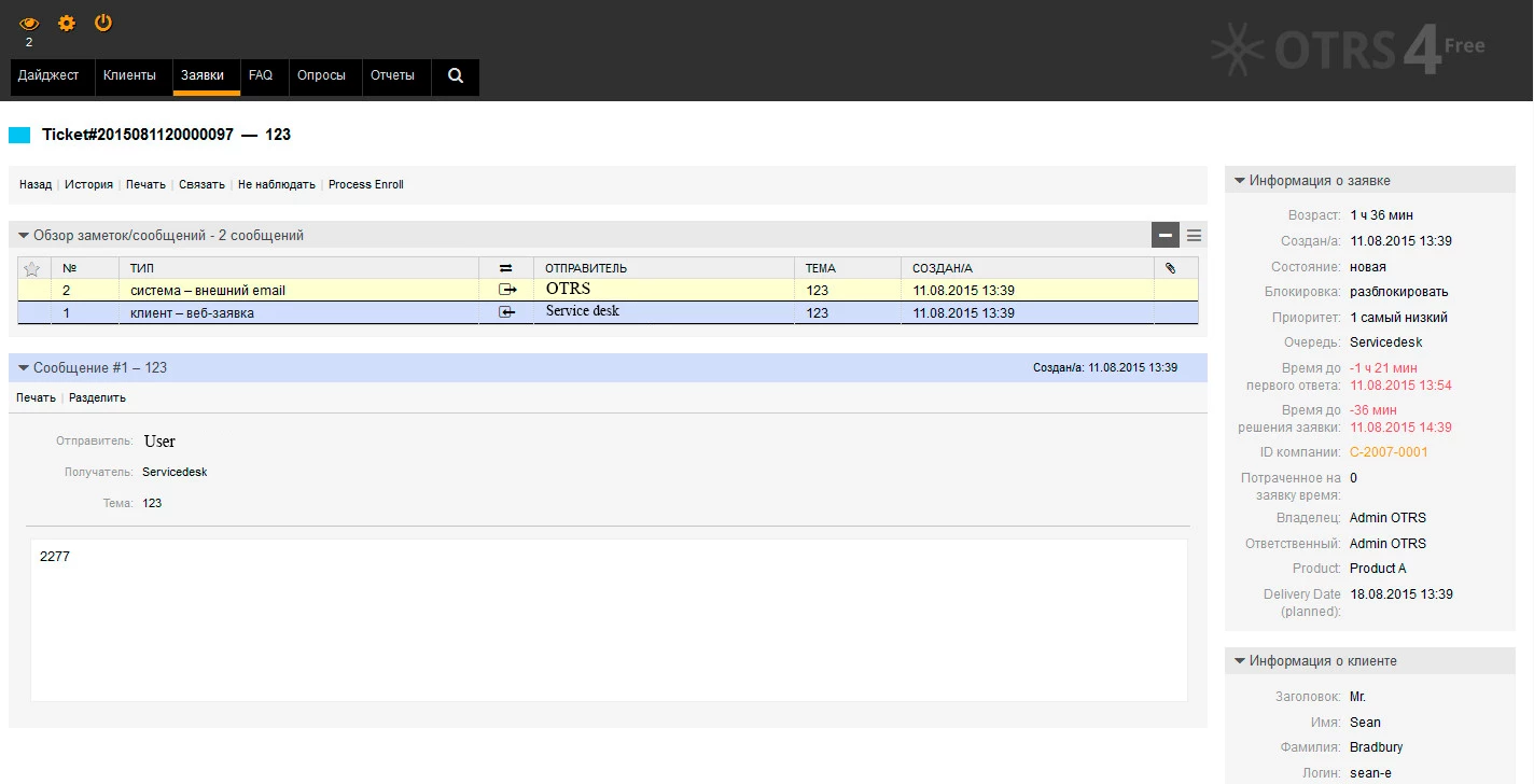 - Скудный интерфейс. Пользовательский интерфейс OTRS не блещет изобилием красок или дизайнерскими элементами оформления. Строгий монотонный интерфейс выглядит достаточно скучно, на уровне тех далеких времен двухтысячных годов. Но нужно отдать должно, все необходимо в нем присутствует.