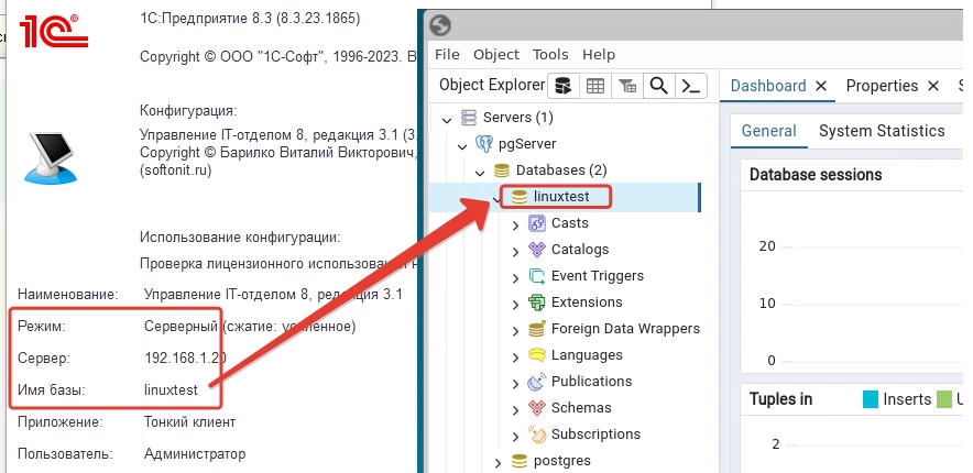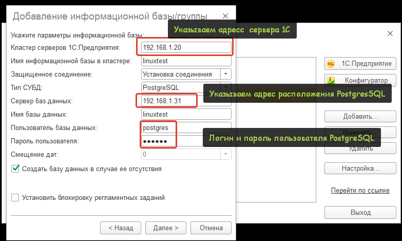 И наконец, окончательно удостоверимся в том, что наша система управления базами данных готова к работе. А для этого заведем новую базу. Т.к. мы еще не установили «сервер 1С» на наш сервер под управлением Linux (сделаем это в другой статье), то воспользуемся консолью серверов 1С расположенной на другой машине.