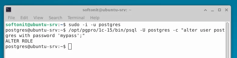 /opt/pgpro/1c-15/bin/psql -U postgres -c "alter user postgres with password 'тут вводим пароль';"
