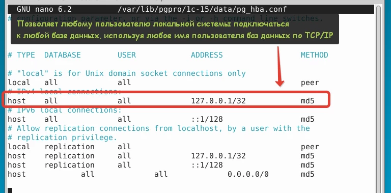 sudo nano /var/lib/pgpro/1c-15/data/pg_hba.confВнутри файла содержатся строки разрешения с параметрами: