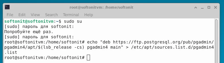 2. Добавим в файл «pgadmin4.list» ссылку на репозиторий. Если терминал будет ругаться "отказано в доступе", просто выполните строку от root