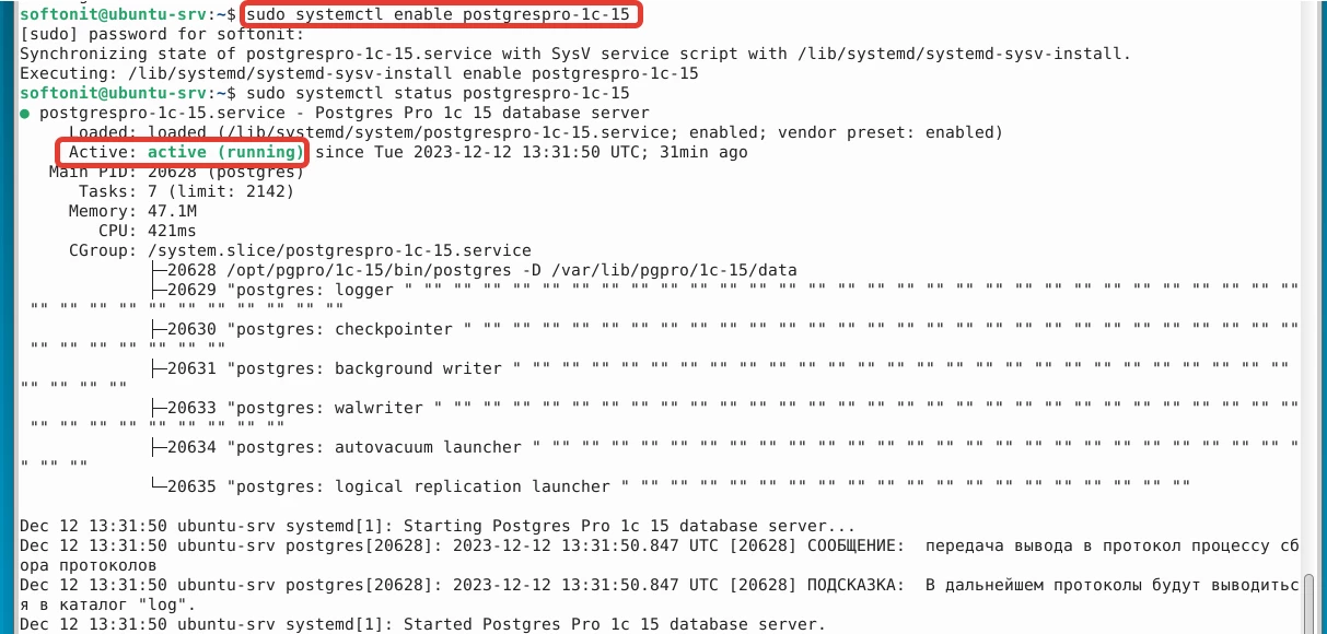 sudo systemctl enable postgrespro-1c-15