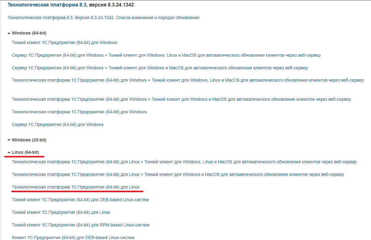 Для установки мы выбрали версию 8.3.24.1342. На момент написания статьи это была последняя версия. В списке я выбрал архив с run- файлом.