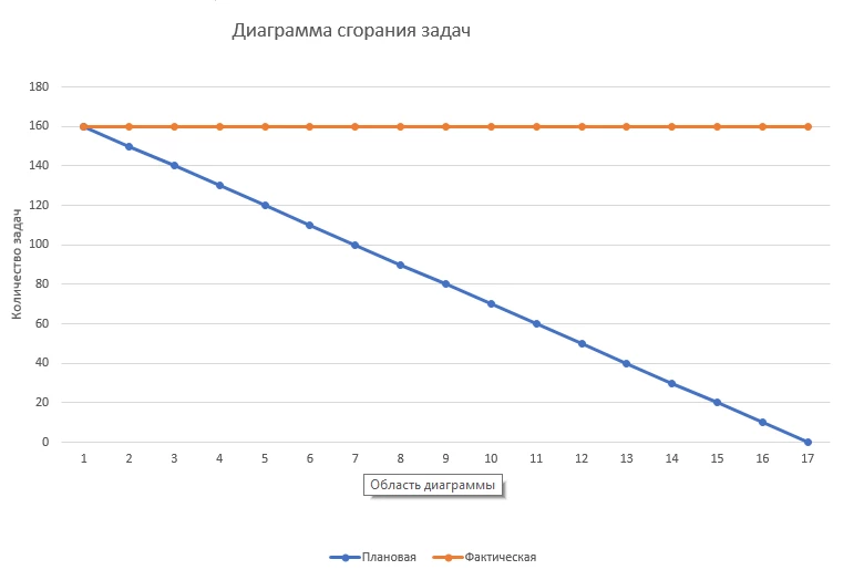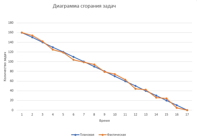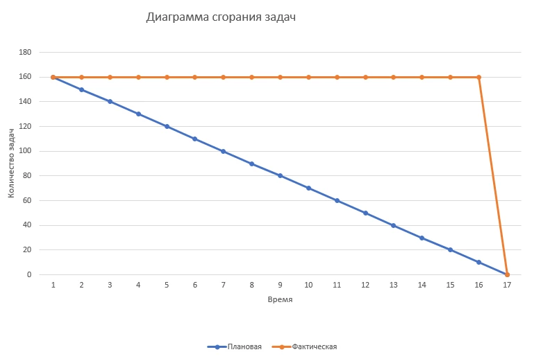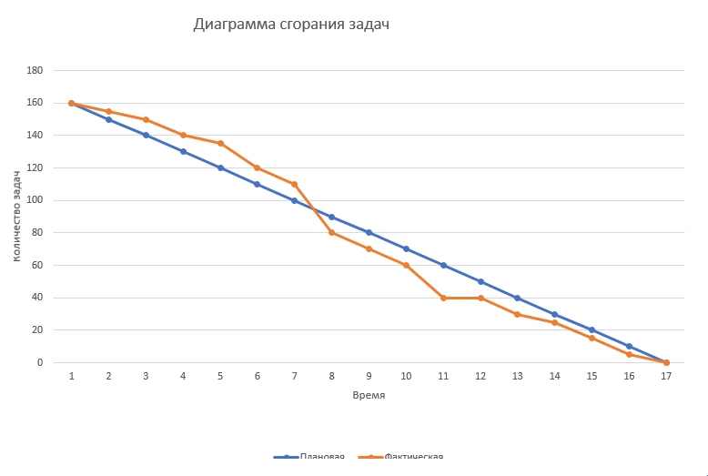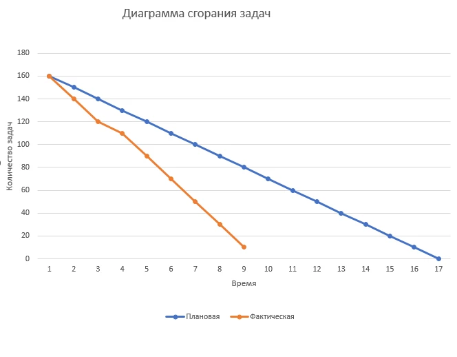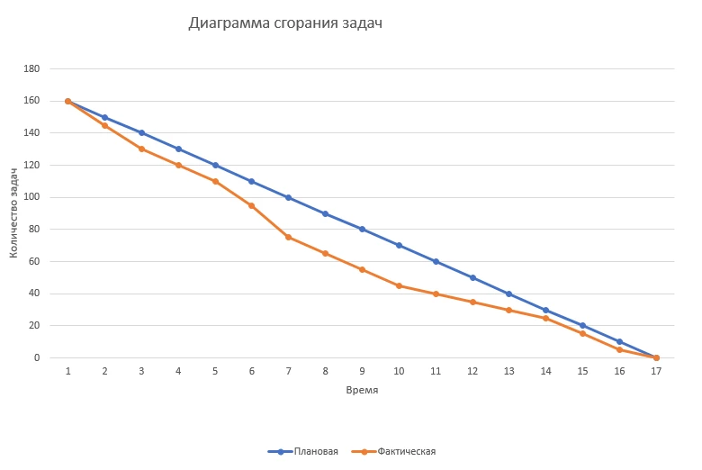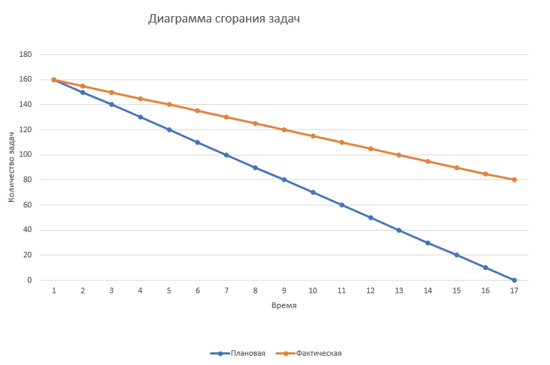 Оси координат — это количество задач и время, точнее выбранный для реализации данного плана период времени, например спринт. Так с течением времени задачи закрываются, и линия стремится к нулю. На основе отклонения фактической линии от эталонной видно, насколько планы по работе отдела отклонялись фактически и нужно выявить причину и найти решение. Диаграмма полезна будет и на этапе выполнения- можно видеть, насколько идет отставание или опережение плана, при необходимости пополнить новыми задачами.