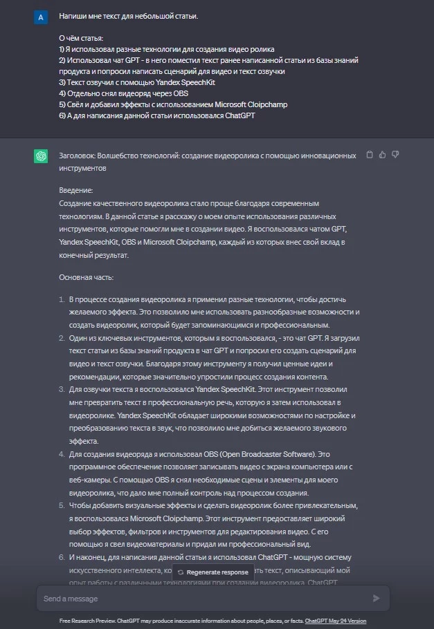 ChatGPT - мультитул в умелых руках. Загружаем текст статьи из базы знаний продукта в чат GPT и просим создать сценарий для видео и текст озвучки. В результате получаем идеи и рекомендации, которые упрощают процесс создания контента. Остается откорректировать по усмотрению сценарий и подредактировать речь, если нужно.