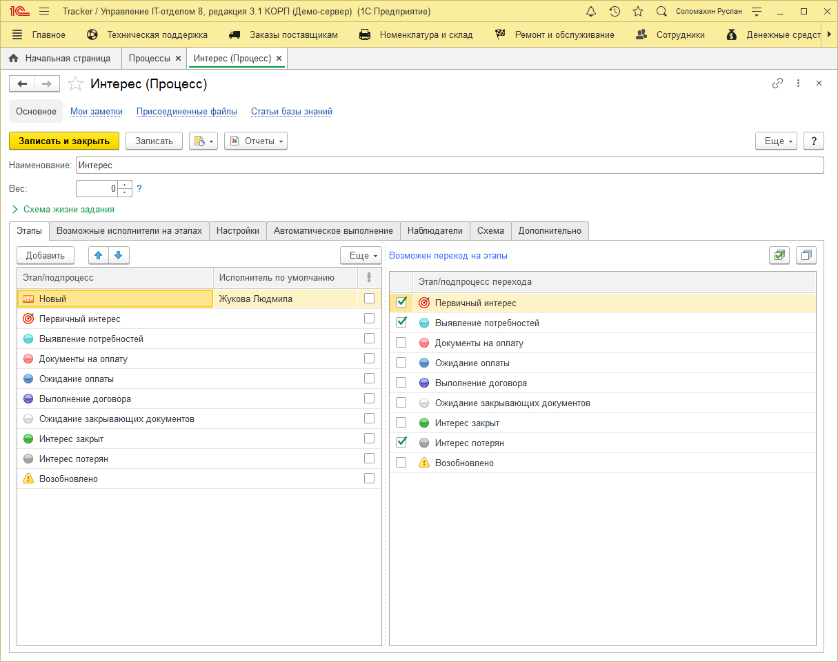 Абстрактные примеры, это хорошо, однако демонстрация на личном опыте покажет куда больше объективных преимуществ в ведении подобного рода бизнеса. Мы не понаслышке знакомы с возможными трудностями в продаже ИТ услуг, так как являемся ИТ-компанией. На старте работы, так же, как и большинство использовали только CRM и испытывали проблемы с этим. Какое-то время, это работало, после чего становилось все трудней и трудней привлекать новых клиентов. Тогда-то и пришли к тому, что нужно работать не только с новыми клиентами, но и продолжать сотрудничество со старыми. В конфигурации «Управление IT-отделом 8» разработчиками, которой мы являемся, была предусмотрена подсистема «Техническая поддержка» или по-другому Service Desk. Так как не хотелось использовать сторонние CRM программы для объединения с нашей разработкой. Было принято решение разработать в программе дополнительную подсистему CRM. Этот модуль включает в себя сущность «Потенциальные клиенты», предусматривает удобную работу с «Канбан-доской», а также полностью взаимодействует с подсистемой Service Desk-а. Разберем более подробно. Первое, что необходимо, это создать новый процесс, в результате должно получиться что-то подобное: