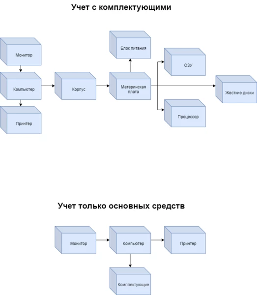 Должны сами для себя определить, как эффективнее и удобнее осуществлять учет оборудования. Учитывать технику со всеми комплектующими или без, беря в учет только основные средства. Далее нужно поподробней разобраться с составляющими схемы, которая используется в внедрении CMDB.