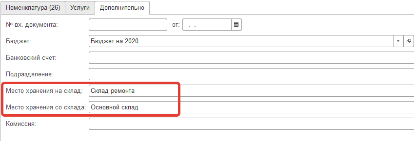 Факт переноса отразим в документе "Начало обслуживания", в поле "Место хранения" укажем откуда был взят сервер, а в поле "Место обслуживания" место, где будет произведен ремонт. После этого с помощью кнопки "Подбор" выбираем нашего подопечного и добавляем в табличную часть. Понятное дело, что вышеупомянутые действия могли быть уже выполнены, в таком случае для этого нужно в поле "Состояние" выбрать на каком этапе происходит или происходил ремонт: в работе, выполнен, открыт, отменен. После заполнения реквизитов, создадим на основании, документ "Окончание обслуживания", таким образом заполненные поля подставятся и не придется заново заполнять одно и тоже. Единственное, что необходимо заполнить это два поля на закладке "Дополнительно", поле "Место хранение на складе" и поле "Место хранения со склада". Первое отвечает за то, куда будет помещена неисправная комплектующая, а во второе указывает место откуда, берется деталь для замены (рисунок 2).