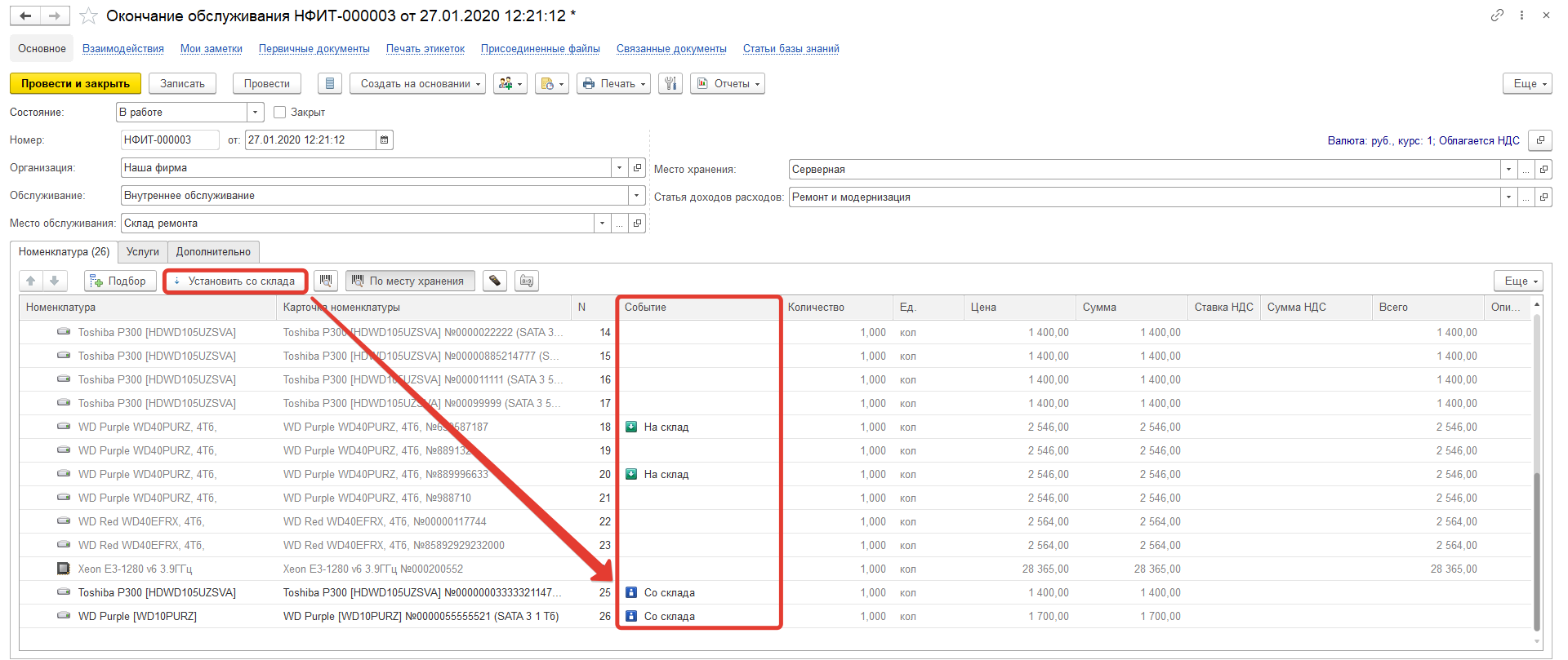 Теперь единственное, что остается, это в табличной части провести замену комплектующих. У двух неисправных жестких дисков в поле «Событие» указываем значение «На склад», после чего кнопкой «Установить со склада» добавляем два новых диска и для этих двух позиций в аналогичное поле устанавливаем значение «Со склада». В результате проведения документа получаем следующее, неисправные жесткие диски отправляются на место хранения, которое было указано на закладке «Дополнительно», в данном примере, это «Склад ремонта» и числятся на остатках. А новые жесткие заносятся в комплект сервера и перестают числиться за местом хранения «Основной склад» (рисунок 3). Последний шаг, это переброска документом «Перемещение» отремонтированного сервера обратно на свое место. Данный вариант подойдет в том случае, если при оприходовании сервера документом «Поступления» или при сборках комплекта не был отмечен чек-бокс «Объединить все строки верхнего уровня в комплекты». Иначе стоит воспользоваться вторым способом, описанным ниже.