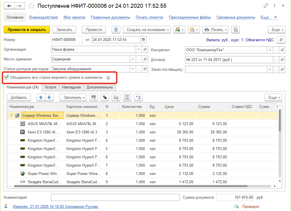 Когда учет ведется упрощено (без комплектующих), то номенклатура нижнего уровня, входящая в состав верхнего, объединяется в комплекты. Тогда перед началом работы с функционалом «Ремонт и обслуживание» Вам надо выполнить разбиение комплекта документом «Разбиение комплектации». Заполнение реквизитов документа интуитивно понятны, но стоит обратить внимание на одно поле «Тип разукомплектации». При указании этого реквизита, стоит помнить, если в поступлении Вы указали галочку «Объединить все строки верхнего уровня в комплекты» (рисунок 4), то нужный тип разукомплектации в таком случае «Разбить объединенные комплектующие».Рисунок 4 - "Активный чек-бокс".