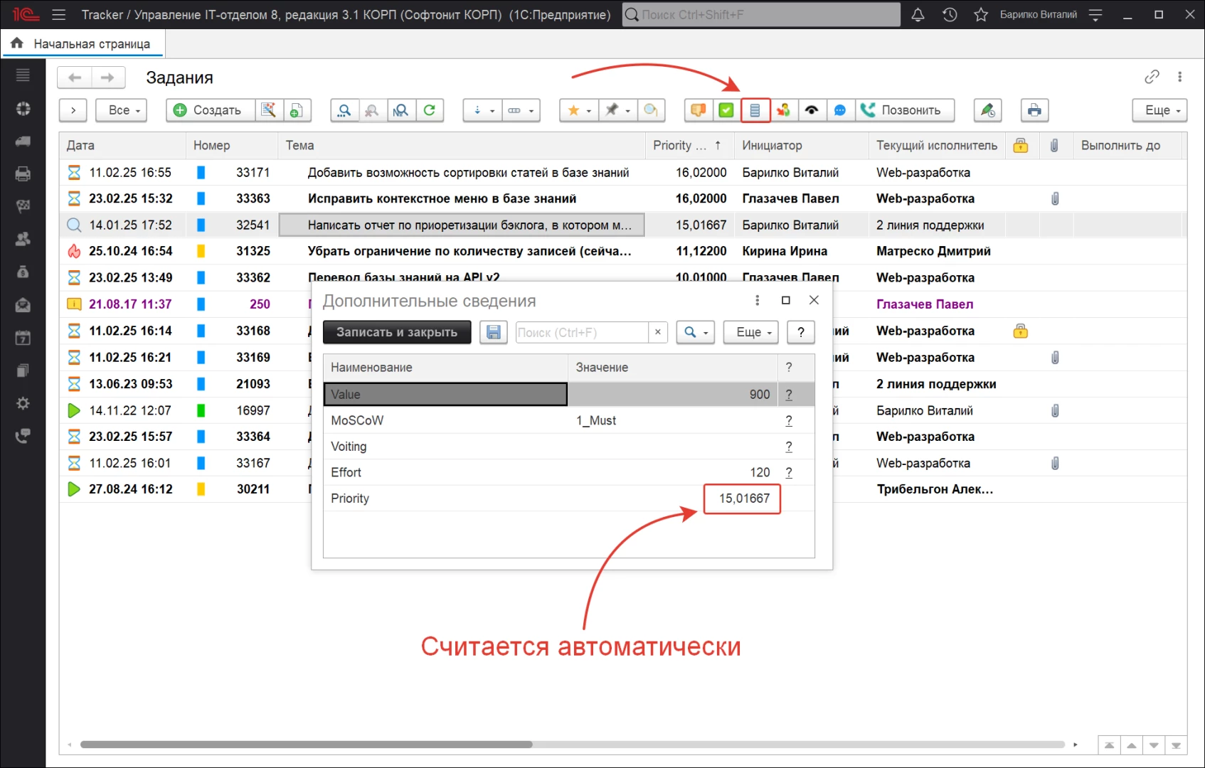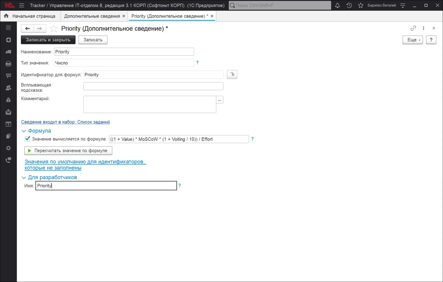 Теперь открывая объект мы будем видеть добавленные реквизиты-оценки и можем их менять. При этом реквизит Priority при изменении других реквизитов пересчитываться автоматически: