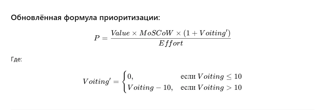 Voiting (голоса клиентов за фичи / доработки) — это уже наши клиенты и их голоса, которые влияют на вес. Кто‑то может возразить, что «как же так, Value считай всем рулит, а по идее должны сильно влиять голоса клиентов». Все так. Но возникают проблемы с тем, что клиенты не знают, например, о новых фичах и не видят в них смысла, пока не попробуют и вдруг окажется, что эта фича очень даже ничего. Оценка не сильно увеличивается, но после 10 отданных за фичу голосов происходит ее значительный буст.