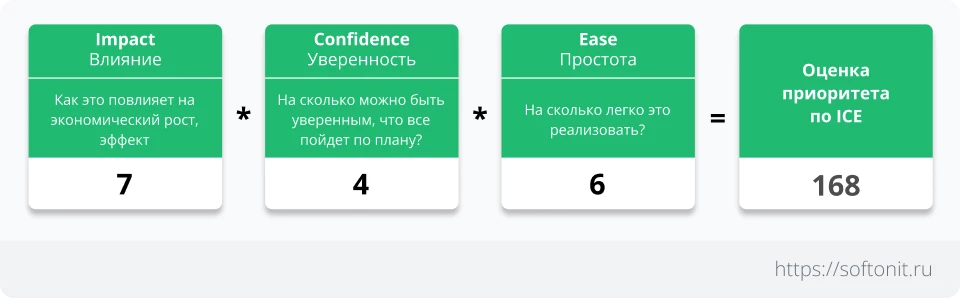 Каждый критерий оценивается по шкале от 1 до 10, где 10 — максимальная значимость.ICE = Impact × Confidence × Easy