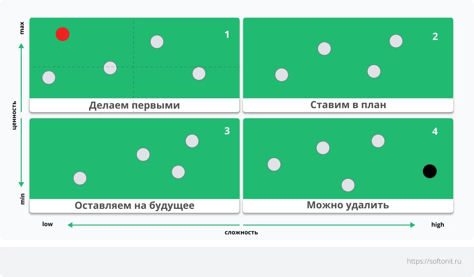Метод матрица «Value vs Effort» представляет собой инструмент приоритизации задач, позволяющий визуально оценить соотношение между ценностью (value) и сложностью (effort), необходимыми для реализации каждой задачи.