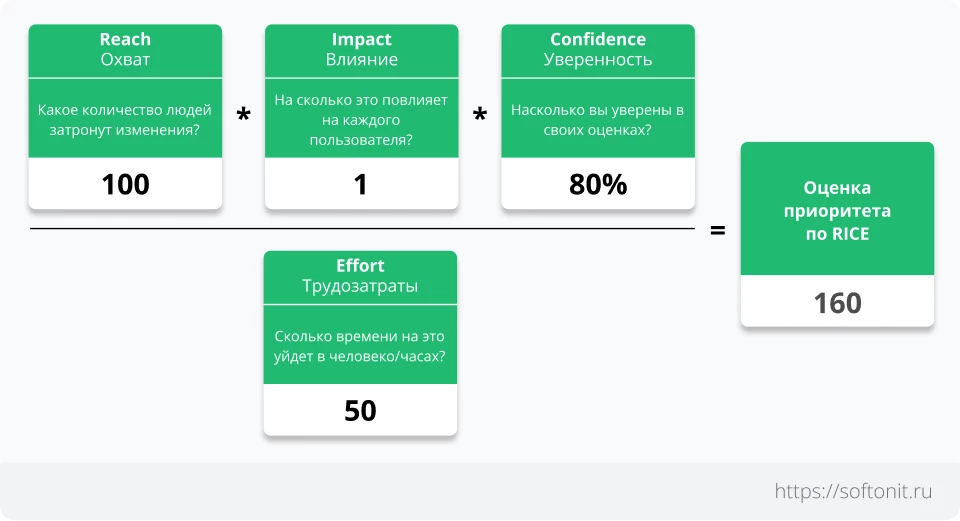 Каждый критерий оценивается по своей шкале:RICE = (Reach × Impact × Confidence) / Effort