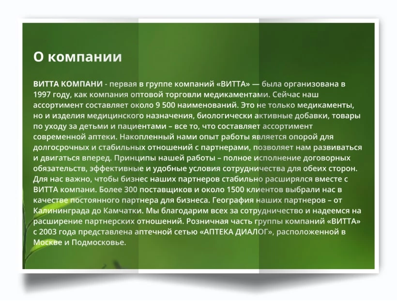 «Витта компани» - это оптовое направление, а розница – это аптечная сеть ДИАЛОГ - 78 аптек, расположенных в Москве и в Московской области.