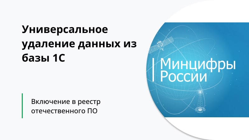 Сегодня стало известно, что 18.11.22 Министерством цифрового развития, связи и массовых коммуникаций Российской Федерации под номером 15595 была добавлена в реестр отечественного ПО наша разработка Универсальное удаление данных из базы 1С.