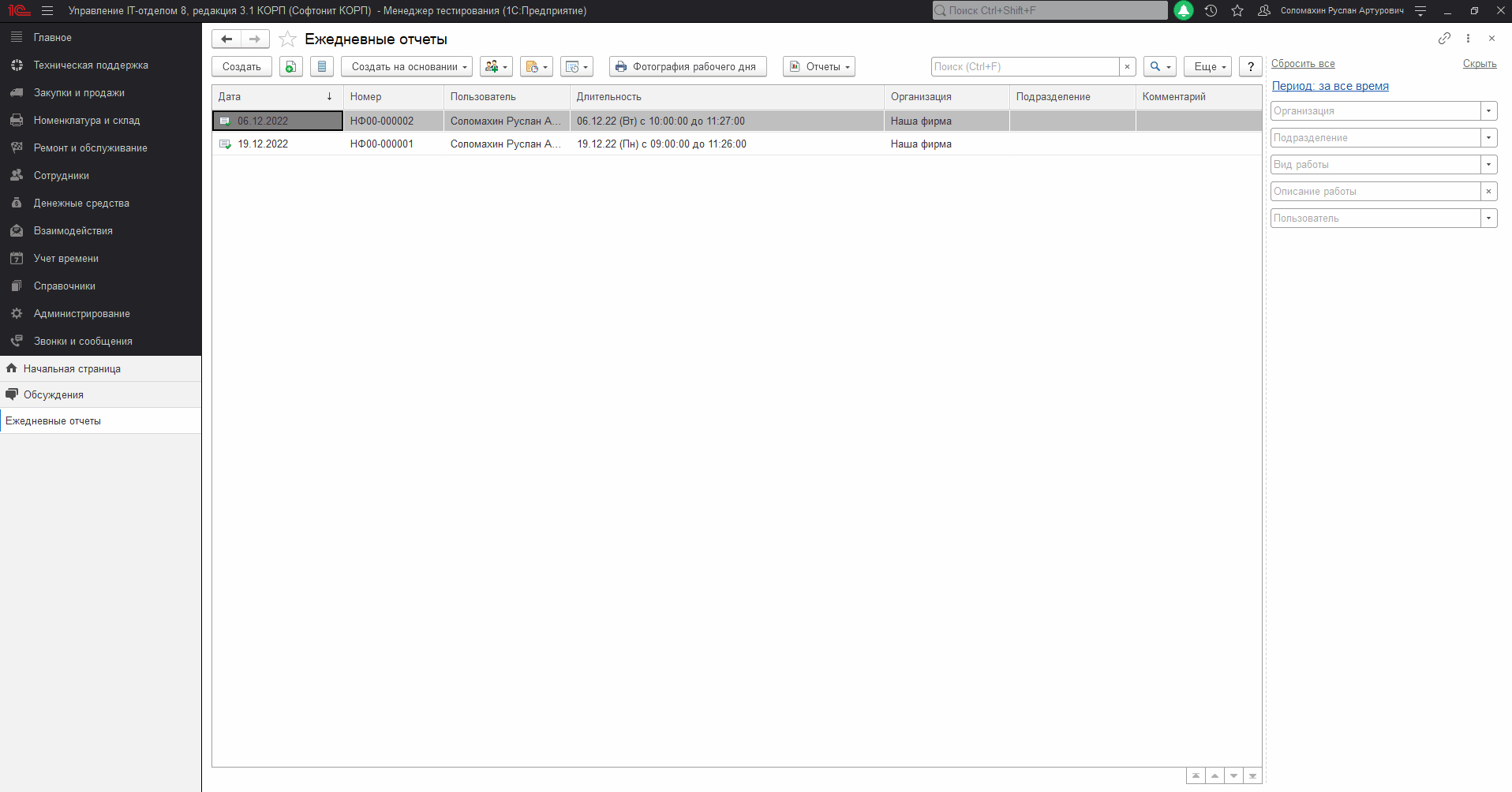 В форме списка документа "Ежедневный отчет" есть возможность быстро сформировать печатную форму "Фотография рабочего дня", по выбранным документам. Теперь данная печатная форма формируется с учетом сортировки по дням выбранных документов.