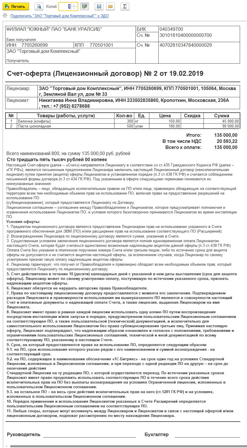 Счет-оферта для 1С:Бухгалтерия 3.0 для ПО